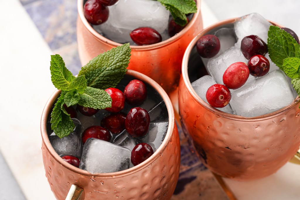 Non-alcoholic beverage moscow mule in copper mugs with cranberry and mint on white marble board
